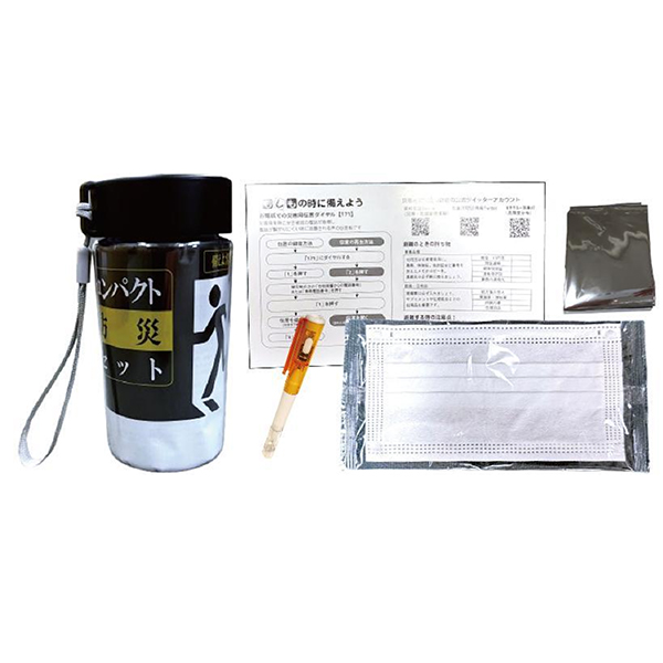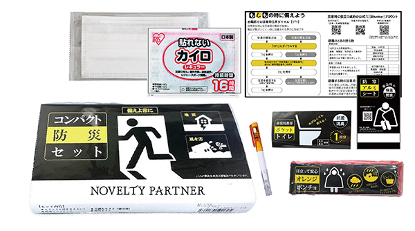 災害時に必要な最小限の内容をセット。フラットホイッスル・携帯用トイレ1P・レインコート・水に流せるペーパー・除菌アルコールウェットティッシュ・カイロ・防災の心得の8点を専用の巾着袋に入れました。コンパクトサイズなので置き場に困らず、バッグなどに入れて携帯することも可能です。名入れをしてノベルティのほか会社の備品などにもおすすめです。