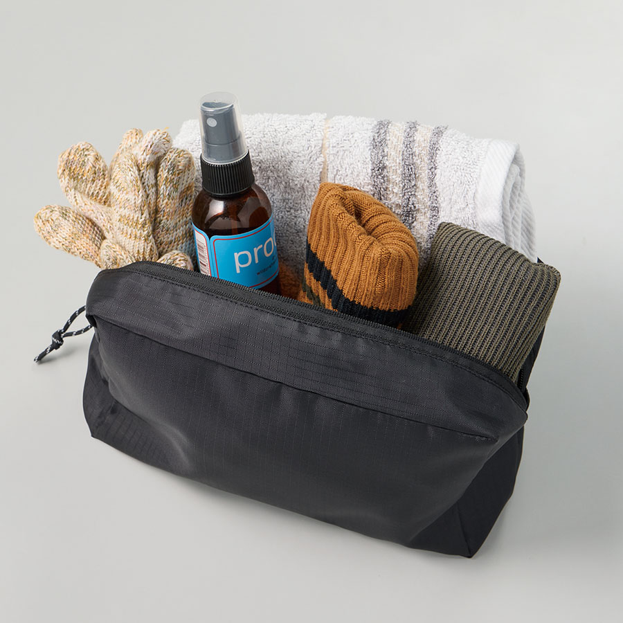 使いやすさとデザイン性を両立したマチ付きリップストップポーチです。ザクザク入れられる便利なスクエア型です。引手部分には柄のコードを採用、ファスナー裏使いでスタイリッシュな印象です。M・Lの2サイズ展開で、Lサイズは容量もたっぷり入れられるため衣料品やアウトドア用具入れなど様々なシーンでご活用いただけます。