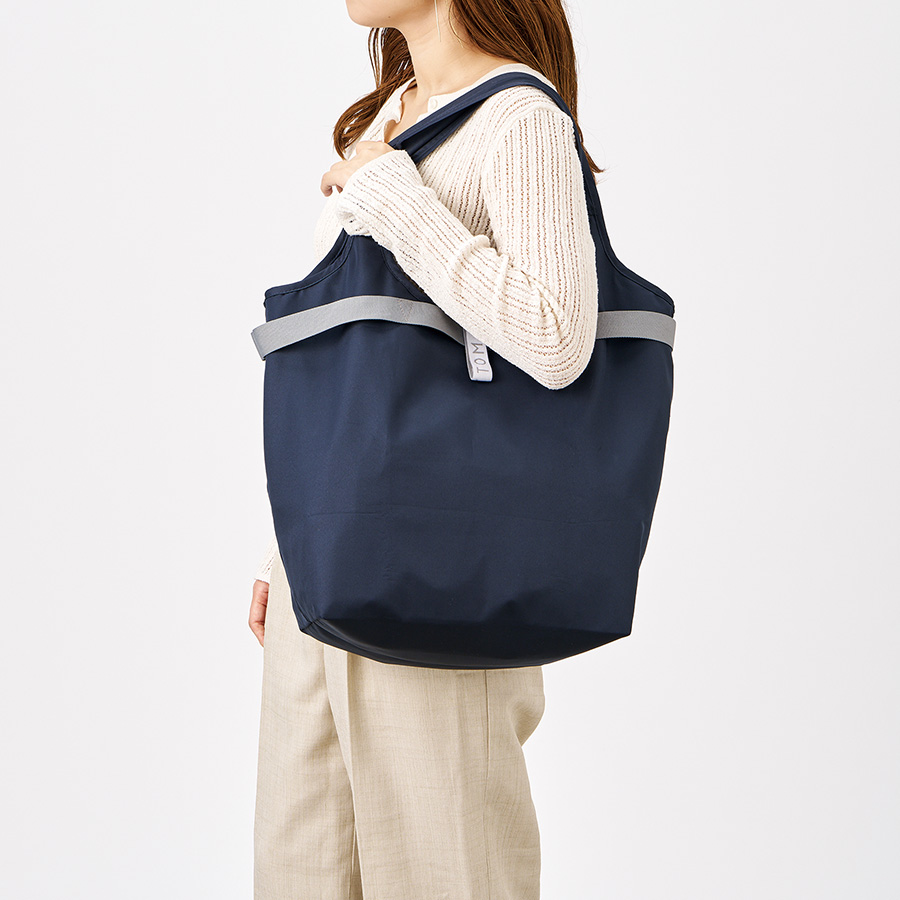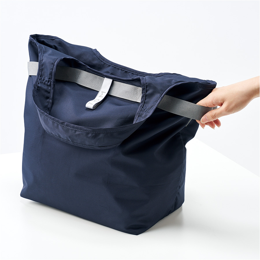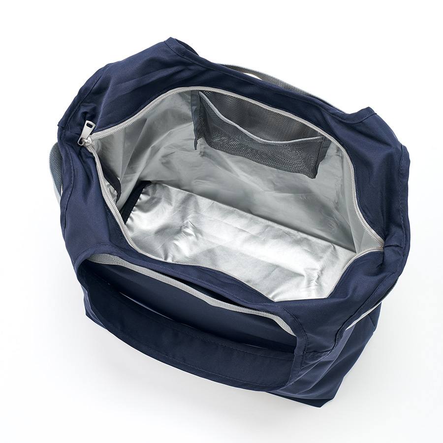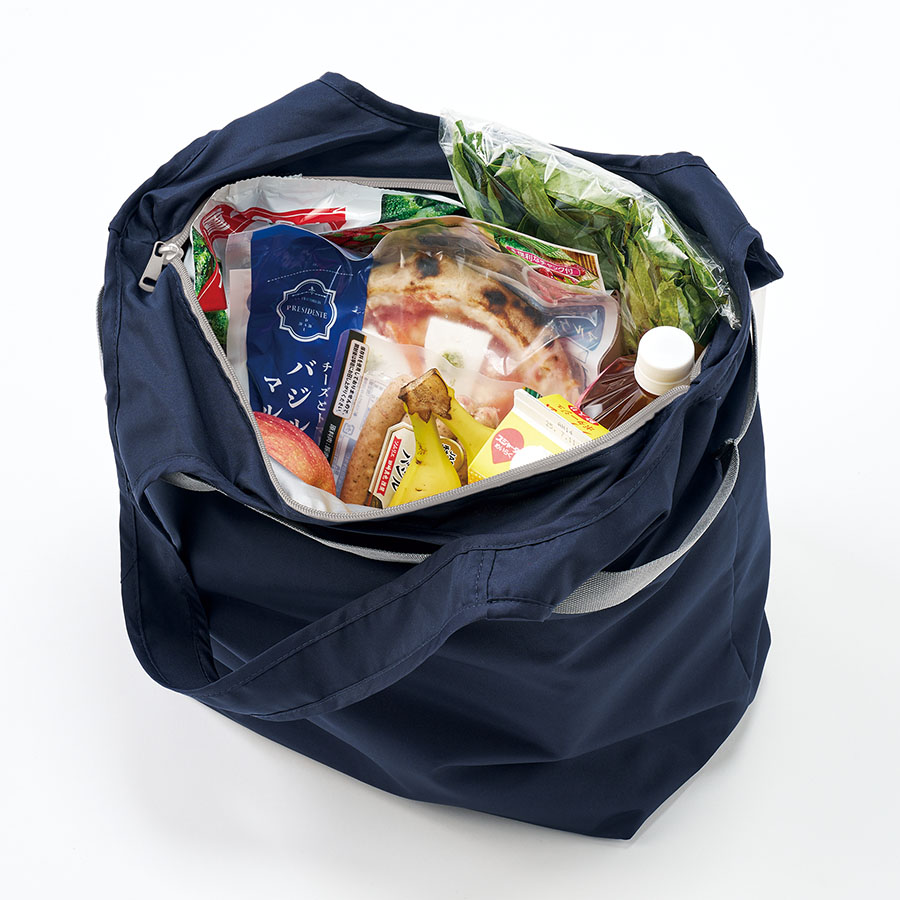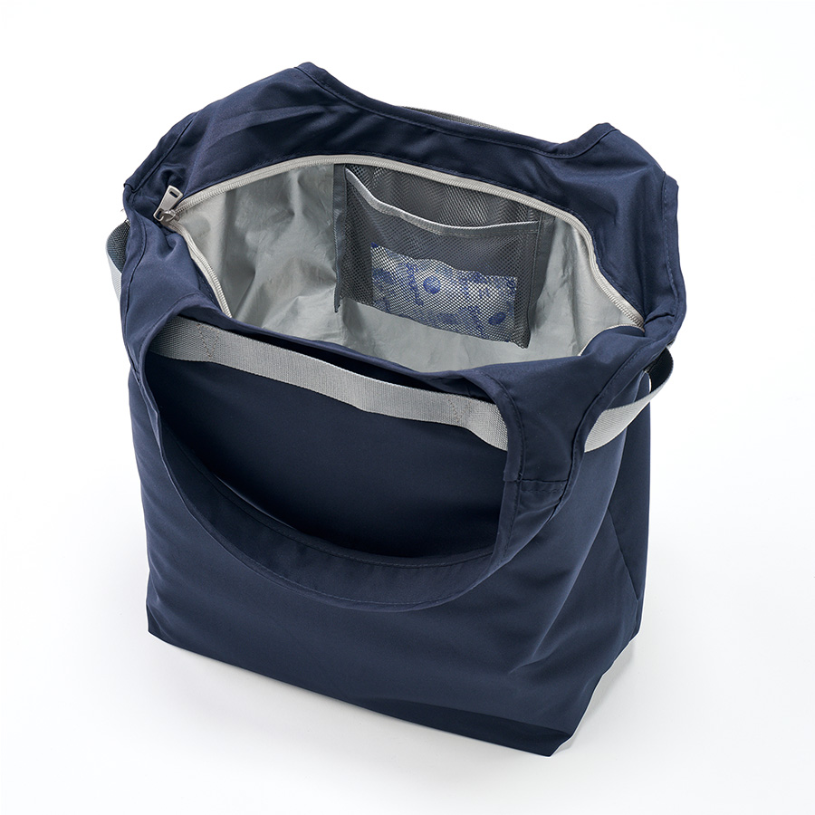 セルフレジで使いやすい、お買い物に便利な保冷バッグです。ゴムでコンパクトに畳むことができ、かさばることなく持ち歩くことができます。本体内側には、うれしい保冷剤用のメッシュポケット付きです。さらにセルフレジで使用する際には、本体外側のテープをバーに引っ掛けて使用することができます。