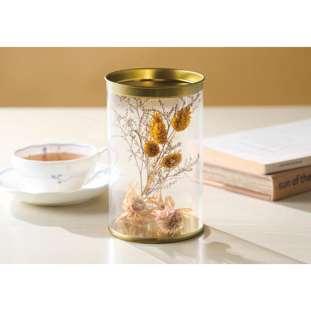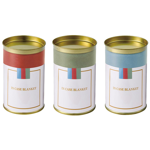 スタイリッシュなゴールドの蓋が印象的な円筒形のクリアケースに、ニュアンスカラーのブランケットを入れました。台紙オリジナル対応も可能ですのでお問い合わせください(※別途お見積り)。クリアケースはディスプレイケースや小物入れとして二次利用も可能です。積み上げて展示すればインパクト抜群です。