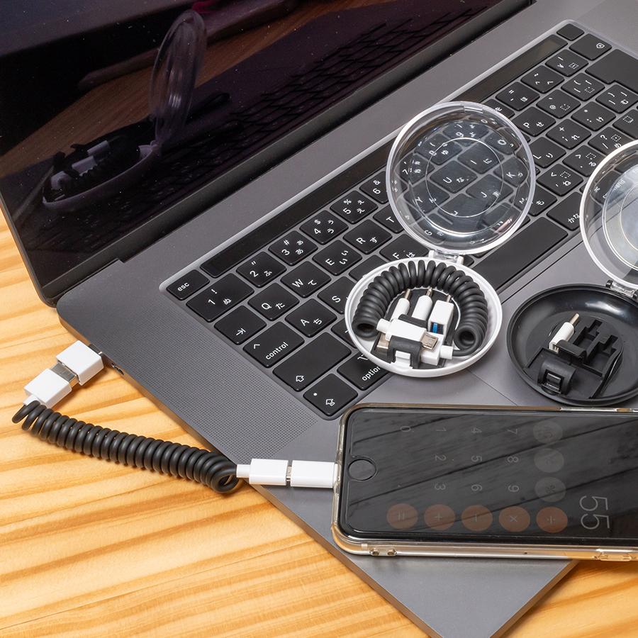 コンパクトなケースに収納されたスマートフォン用充電ケーブル。3種類の変換プラグ付きで様々なポート形状に対応します。ケーブルは伸縮性があるコイル状なのでコンパクトに携帯できます。■充電出力:5V/2A■対応ポート形状:microUSB、USB Type-C、Lightning