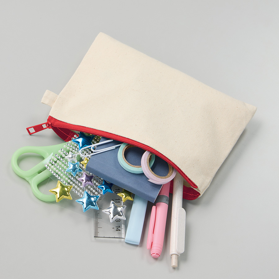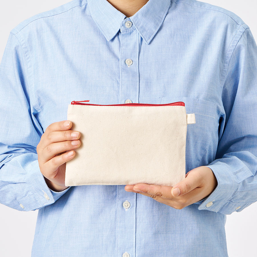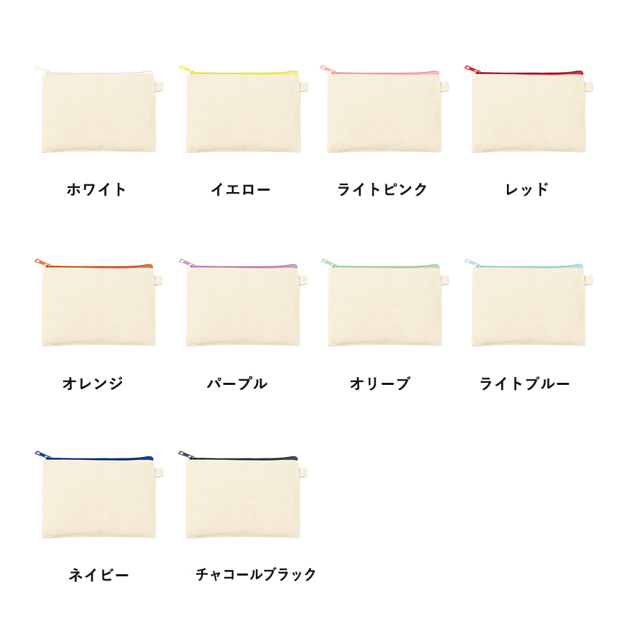 豊富な色展開がポイントのカラーファスナーポーチです。ファスナー部分はカラフルな10色展開ながら、ボディはシンプルなナチュラルカラーのためデザインを選ばずご使用いただけます。また人気のフラットタイプなので、バッグなどにスマートに収納できて便利です。3サイズ展開でご用意しており、Sサイズはステーショナリー入れにもぴったりな程よいサイズ感です。