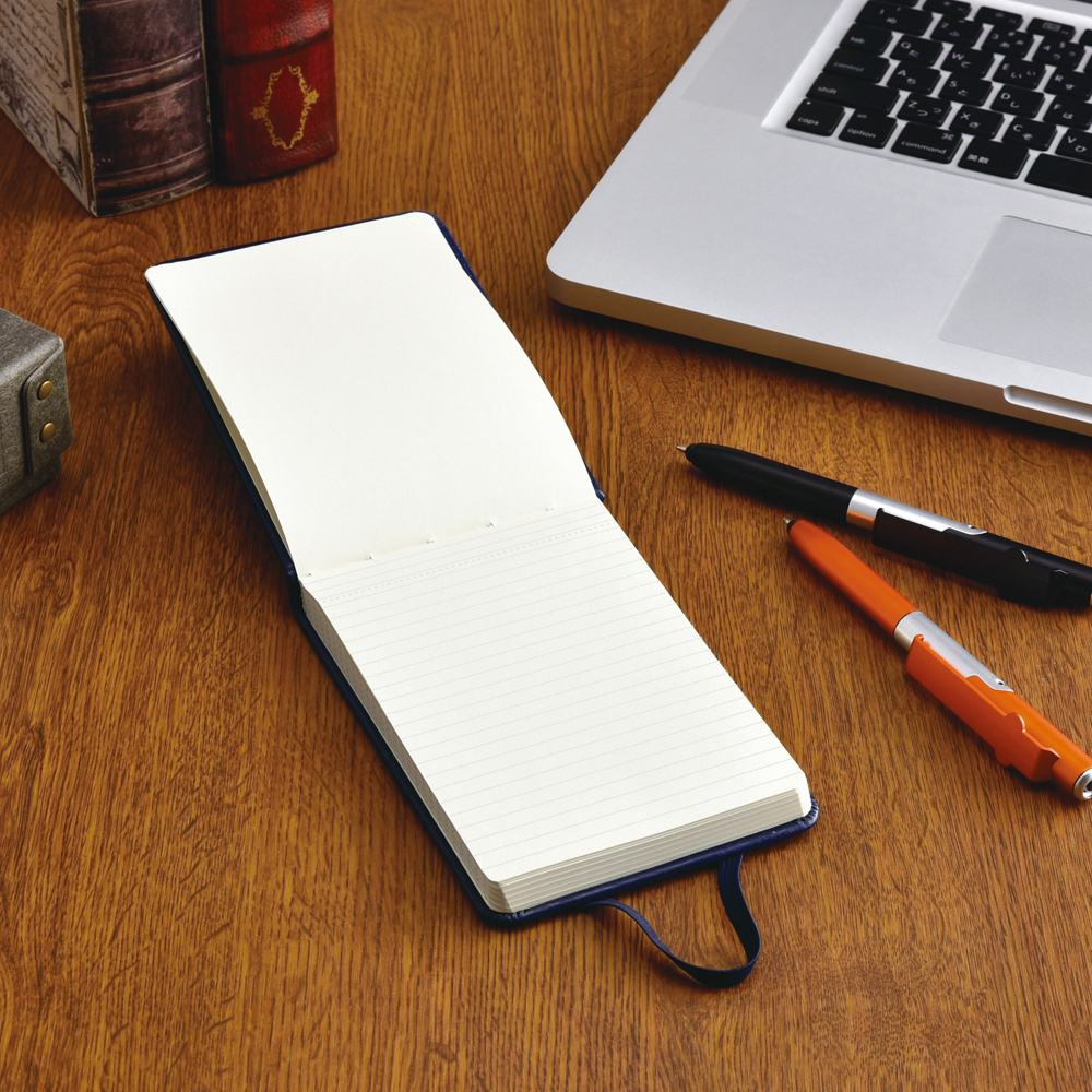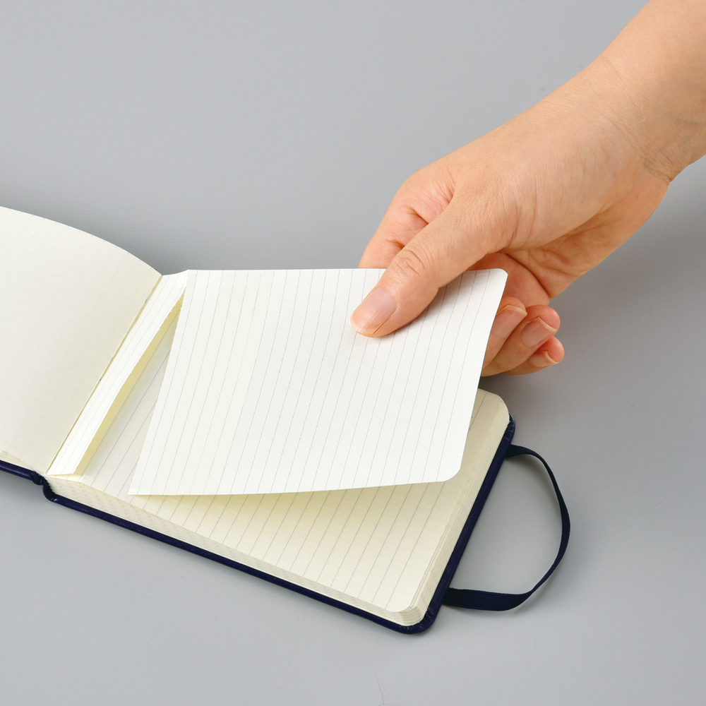 コンパクトで使いやすい ハードカバーメモ A7サイズ(107×75×16mm)。ポケットやバッグにすっきり収まるサイズ感で、外出先でのメモや打ち合わせ、ビジネスシーンに最適です。表紙は高級感のある PUレザー調カバー を採用し、耐久性とデザイン性を両立。カラーは オレンジ・ネイビー・ブルー・ブラック の4色展開で、シーンや好みに合わせて選べます。中紙は ミシン目付きメモ紙96枚(罫線48枚・無地48枚)。アイデアメモや伝言、スケッチなど用途に応じて使い分けが可能です。切り離しもスムーズで、ノベルティや販促品としても喜ばれるアイテムです。