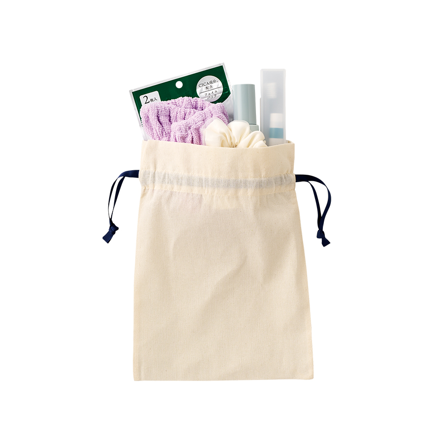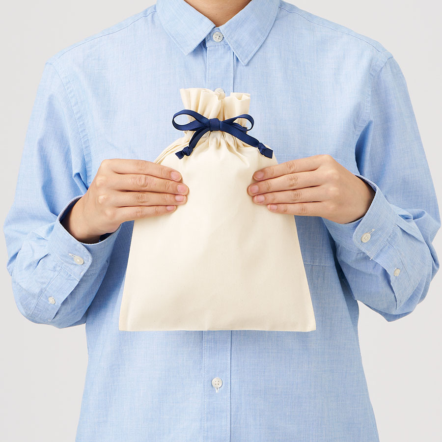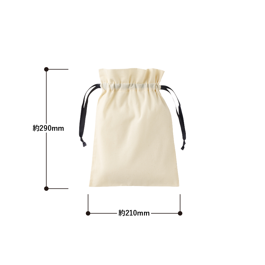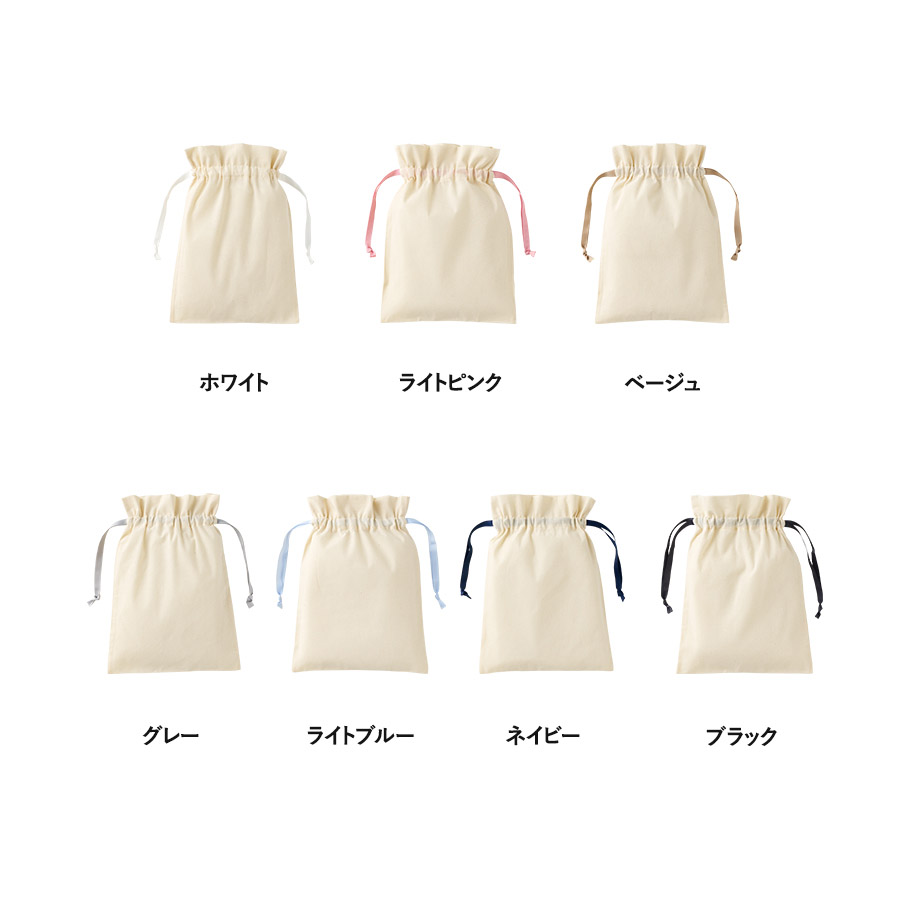 7色展開のカラーリボンがポイントのコットン巾着です。ボディはナチュラルカラーでどんなデザインにもマッチしやすく、リボンは7色展開のため案件にあわせてお好みでお選びいただけます。SS・S・M・Lの4サイズ展開で、Mサイズは十分な容量がありトラベル用ポーチなどとしてもおすすめです。また箱入れされた化粧品など大きめパッケージも入るようなサイズ感です。リボン部分は長めに設定しリボン結びができる仕様で、パッケージとしてもご活用いただけます。単色印刷からフルカラー印刷まで対応可能で、化粧品ブランドや食品関係のパッケージからアパレルブランドのノベルティなどにもご提案いただけます。