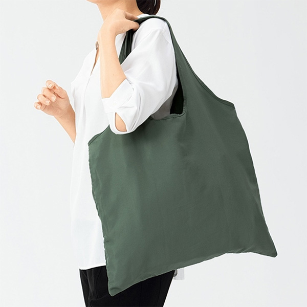 再生PETポリエステルならではのしなやかな質感で、見た目にも高級感があります。普段使いのトートバッグとしても違和感なく使える仕上がりです。スーパーでのお買い物や、まとめ買い、荷物の多い日のお出かけにも十分対応できる頼れる容量です。サステナブルな素材を使いつつ、「使いやすさ」と「見た目の上品さ」を両立したこのエコバッグ。普段使いの買い物バッグとしてはもちろん、企業や店舗のノベルティや記念品としても最適です。
