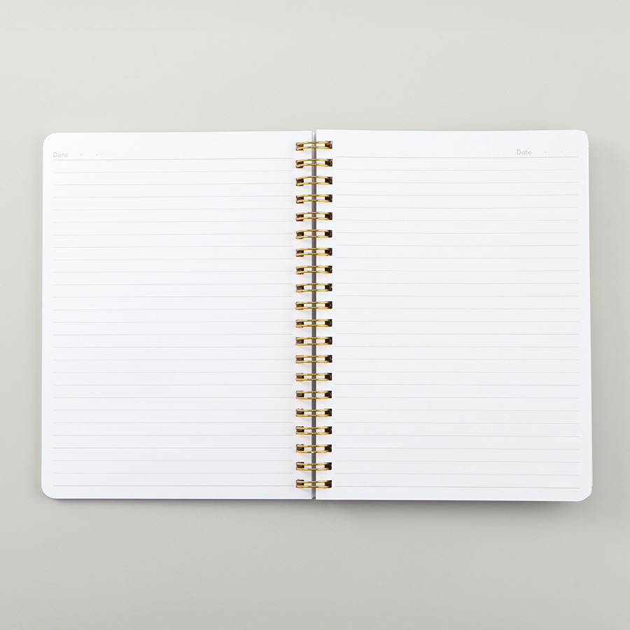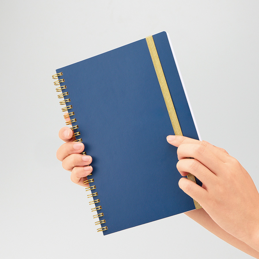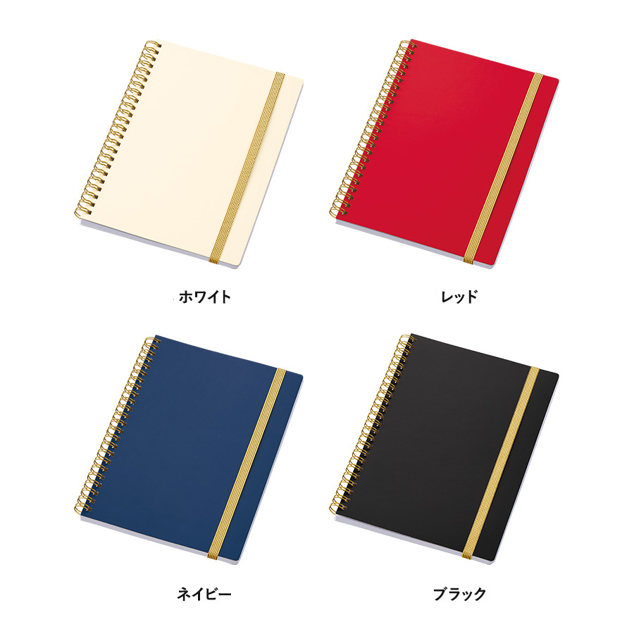 ゴールドのリングとゴムがアクセントの高級感のあるA5ノートです。表紙・裏表紙は白厚紙を使用しており、手触りの良いマットコーティングで、傷がつきにくいのが魅力です。また中紙は6mm罫線で日付入れるスペースもあり、ビジネスシーンでも活躍する仕様です。