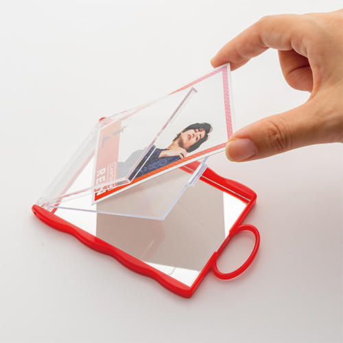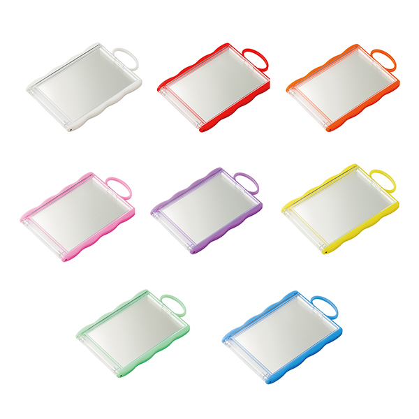 お気に入りのカードを入れて持ち運べるコンパクトミラー。バッグなどに付けられるループ付き。全8色展開です。