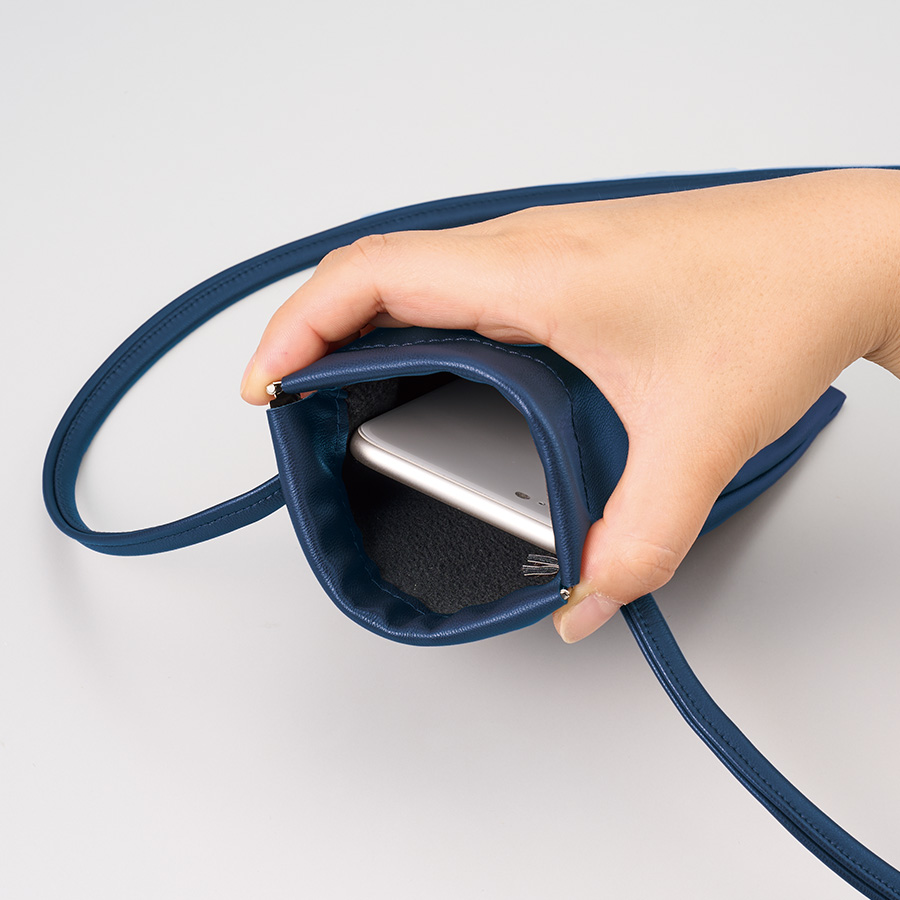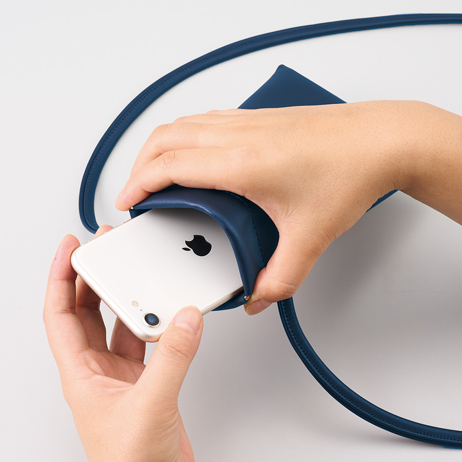 ショルダー紐は肩から掛けて使いやすい長さで、スマホがぴったりと収まる使い勝手の良いサイズ感なので
