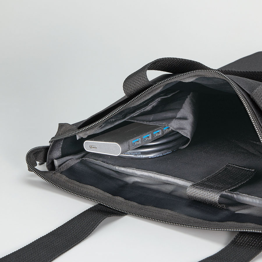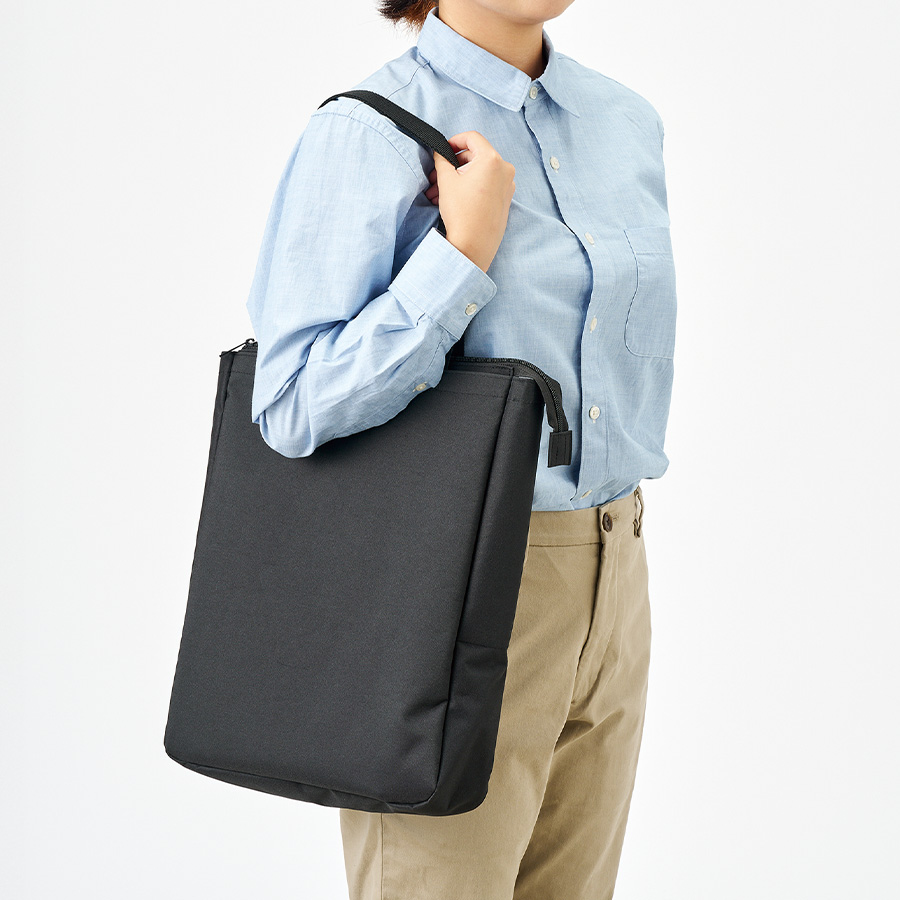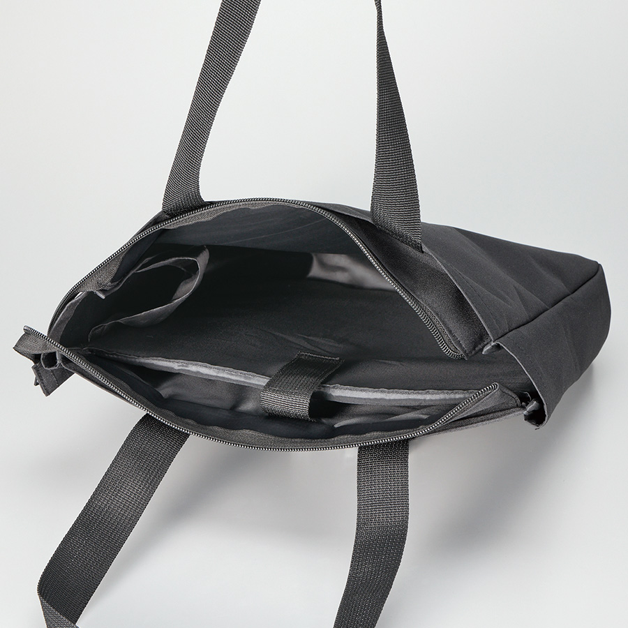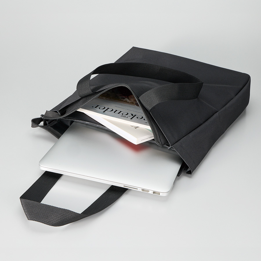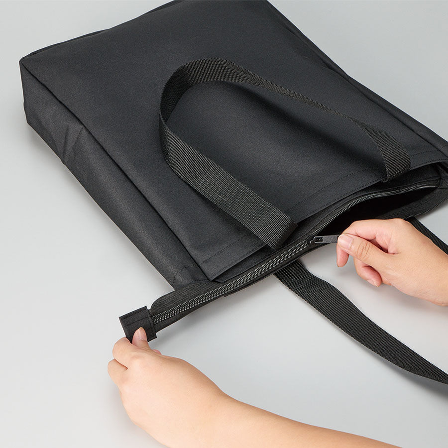 ノートPCを入れて持ち運べるファスナー付きトートバッグです。ポケットとトートの背面部分にはウレタンが入っているため、PCへの負担も軽減できます。またポケットにはベルクロが付いており、ピタット止めておくことができて安心です。またファスナー付きで、バッグ内の目隠しや雨の侵入を防止することもできます。PCだけではなく、資料なども入れることができるため外で仕事をする際や、営業先に行く際にも荷物をまとめて行くことができ便利です。