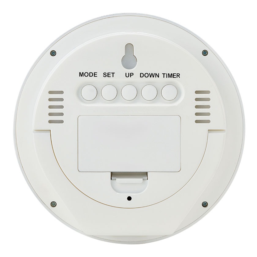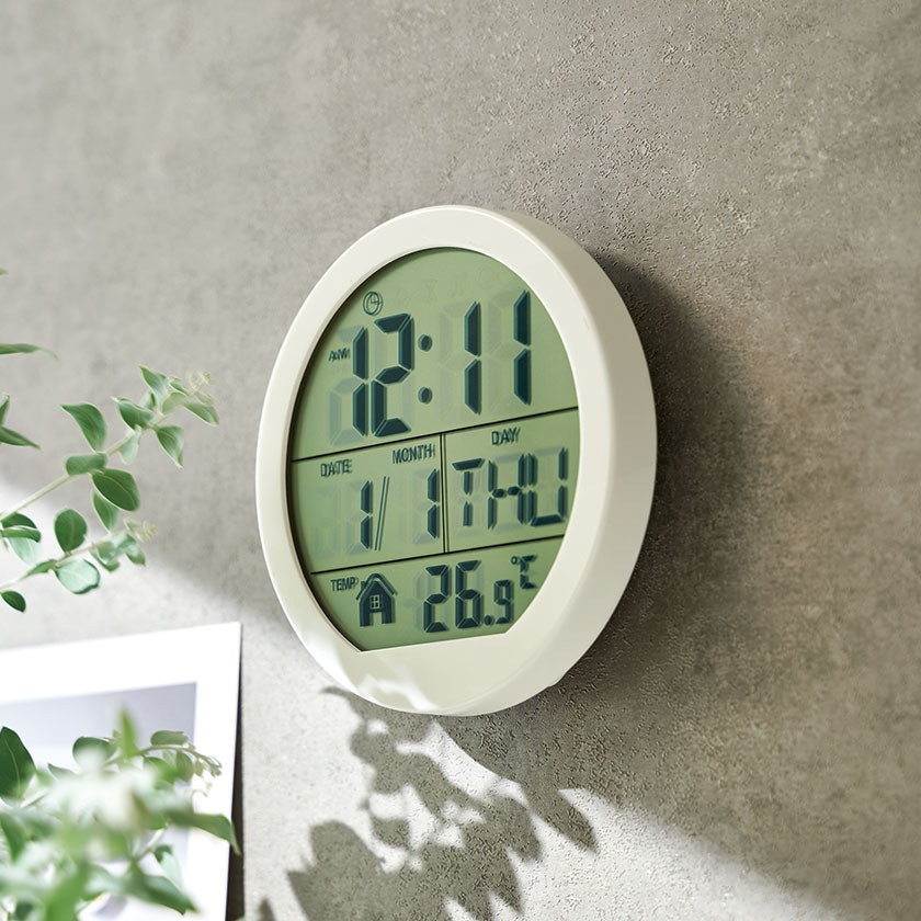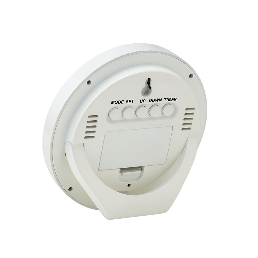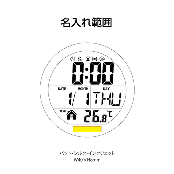 表示が見やすい丸時計。大きめの文字盤とシンプルなデザインで、時間・日付・曜日・温度などの情報がひと目で確認できる便利な多機能時計です。スタンド付きで卓上・壁掛けどちらにも対応し、オフィス・店舗・家庭などさまざまなシーンで活躍します。温度表示やアラーム・タイマー機能も搭載しているので、日常生活だけでなく業務シーンでも実用的に使える設計です。素材はABS樹脂製で軽量ながら丈夫な仕様。名入れ対応(パッド印刷/シルク印刷/インクジェット印刷)に対応しており、法人向けノベルティ・販促グッズとしてもおすすめです。