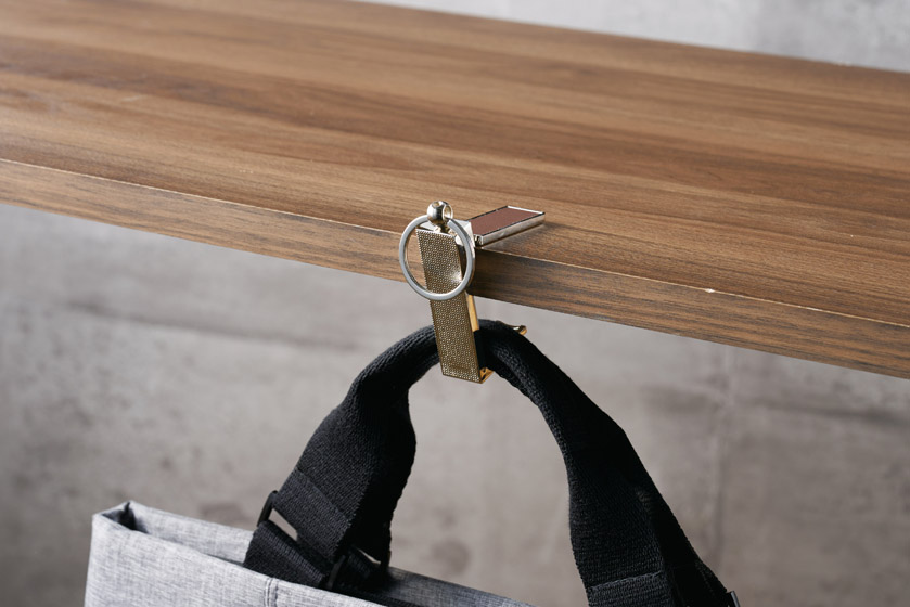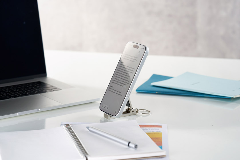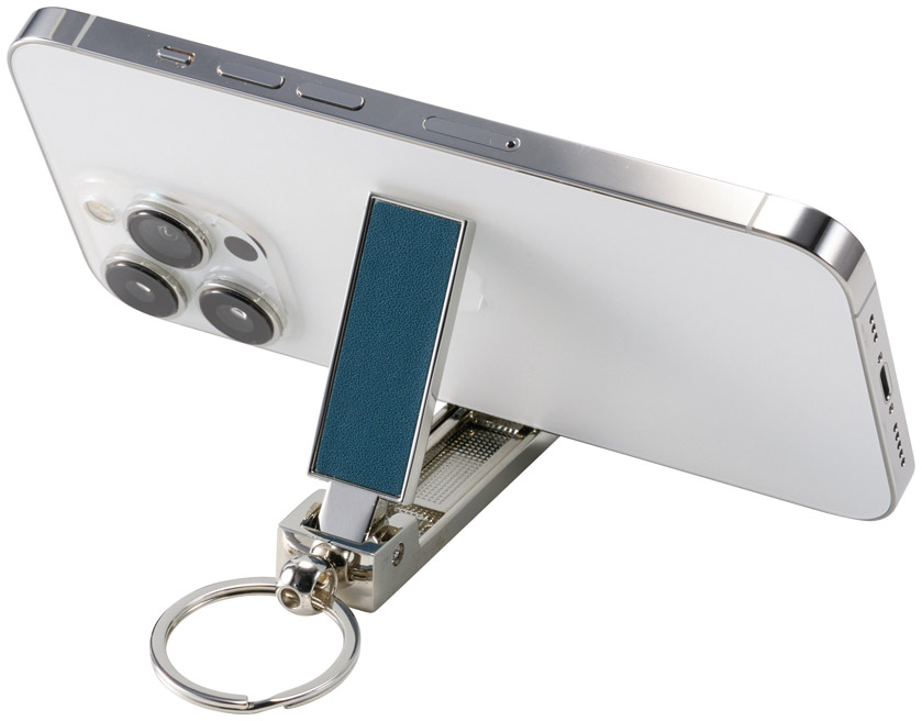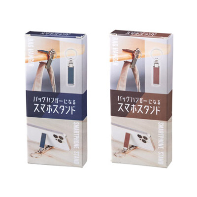 開いて動画視聴に便利なスマホンスタンドとテーブルに掛けられるバッグハンガーの2WAY仕様。ビジネスシーンでの販促品にピッタリです。